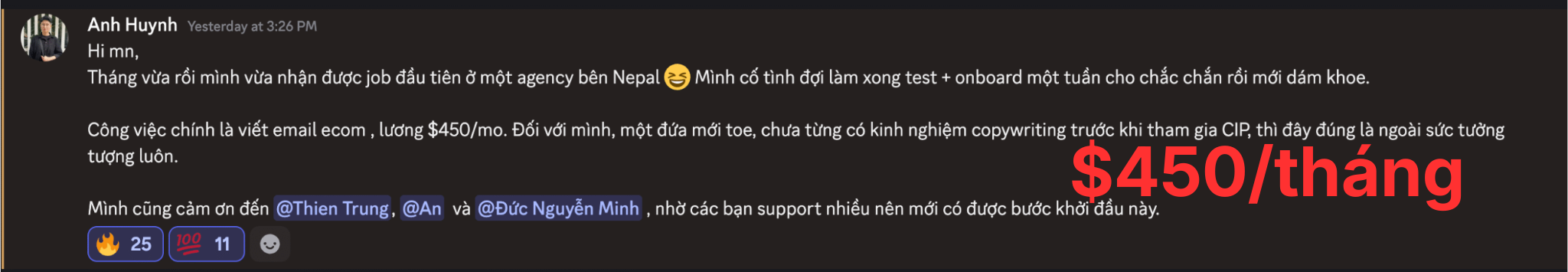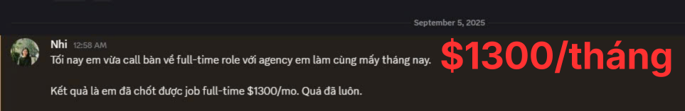 “Nhờ 2 anh mà mình đã tiết kiệm rất nhiều thời gian tự mày mò từ việc cải thiện kỹ năng copywriting, kiếm khách hàng, dùng ChatGPT… Mình cũng đã kiếm được hơn 25 triệu một tháng.”